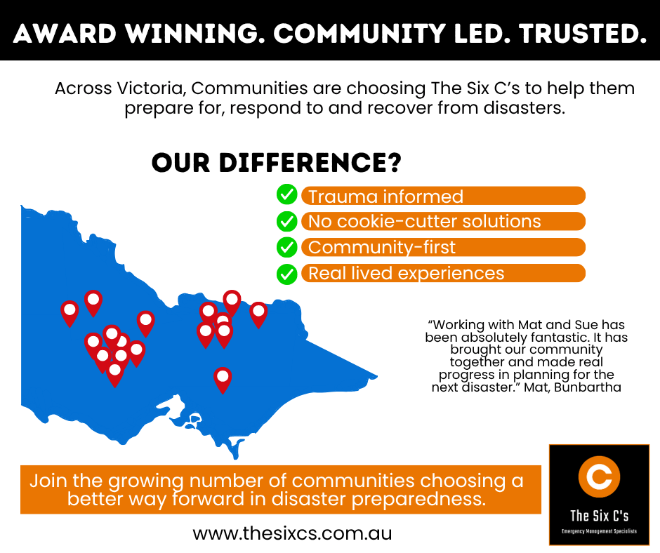 “Mat and Sue from The Six C’s were instrumental in guiding our most flood impacted communities to develop their Community Emergency Management Plans. They didn’t just tell us what to do; they actively listened to our communities’ concerns, incorporated local knowledge, and facilitated workshops that genuinely empowered residents, were light-hearted and fun!