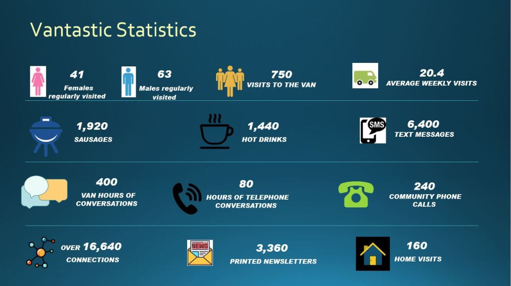 Over 750 visits were made to the van with an average of 20.4 each week with over 400 hours of conversations occuring at the van.